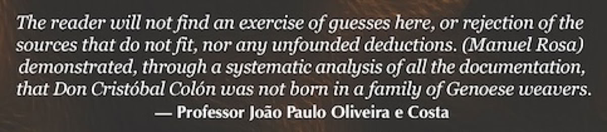 The reader will not find an exercise of guesses here, or rejection of the sources that do not fit, nor any unfounded  deductions. Doctor Manuel Rosa demonstrated, through a systematic analysis of all the documentation, that Don Cristóbal Colón was not born in a family of Genoese weavers. — Professor João Paulo Oliveira e Costa